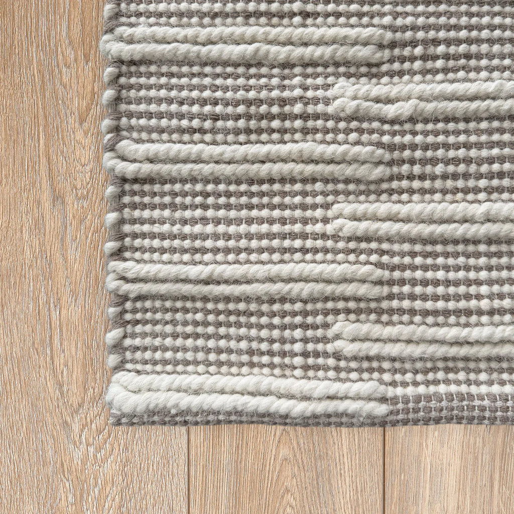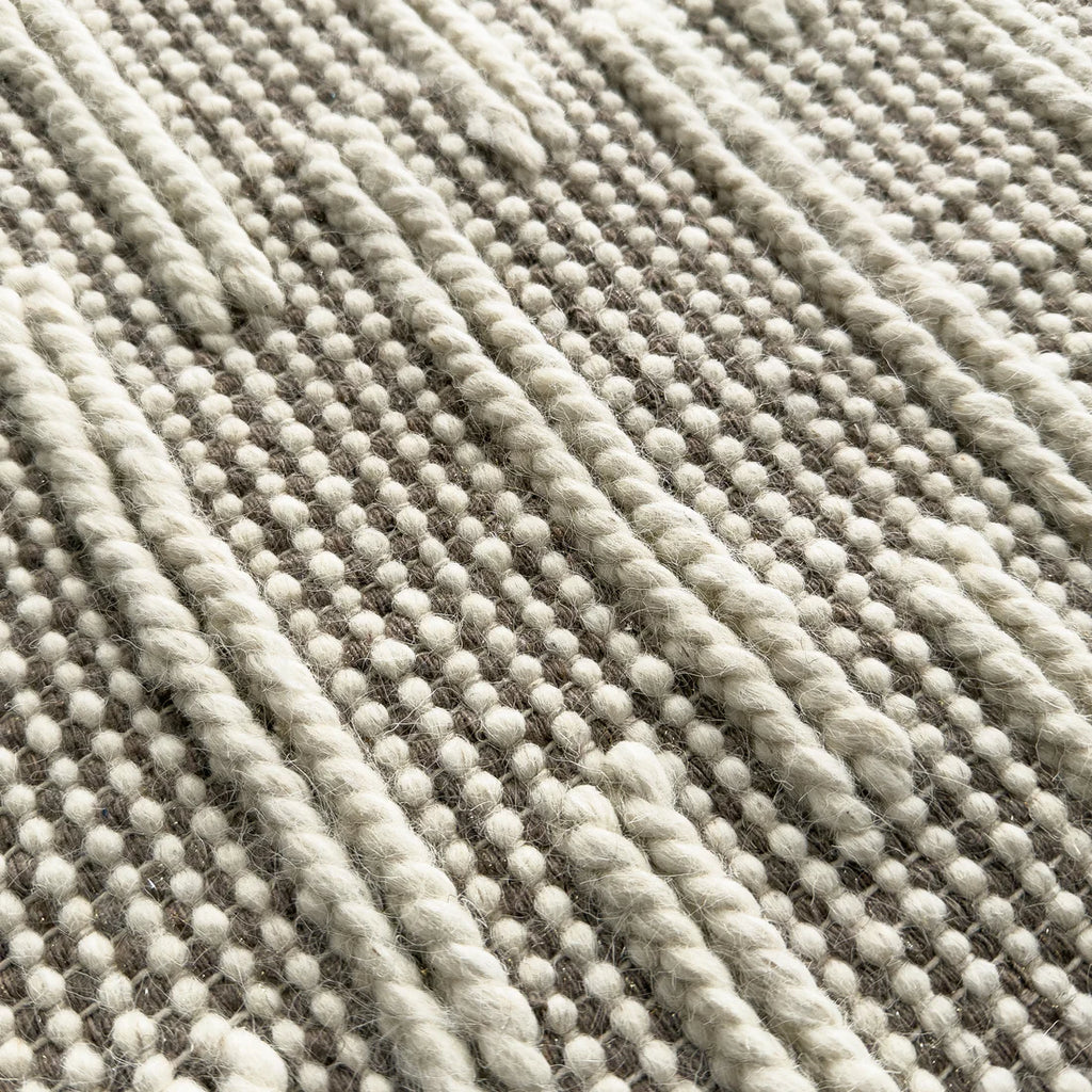 The Ridge rug is made of 80% wool with 20% cotton, handwoven into a simplistic design with a raised rib that brings eye-catching texture to the floor. This rug works perfectly with neutral palettes and integrates well into contemporary and classic interiors. The Ivory beige colourway includes a small fleck of lurex.